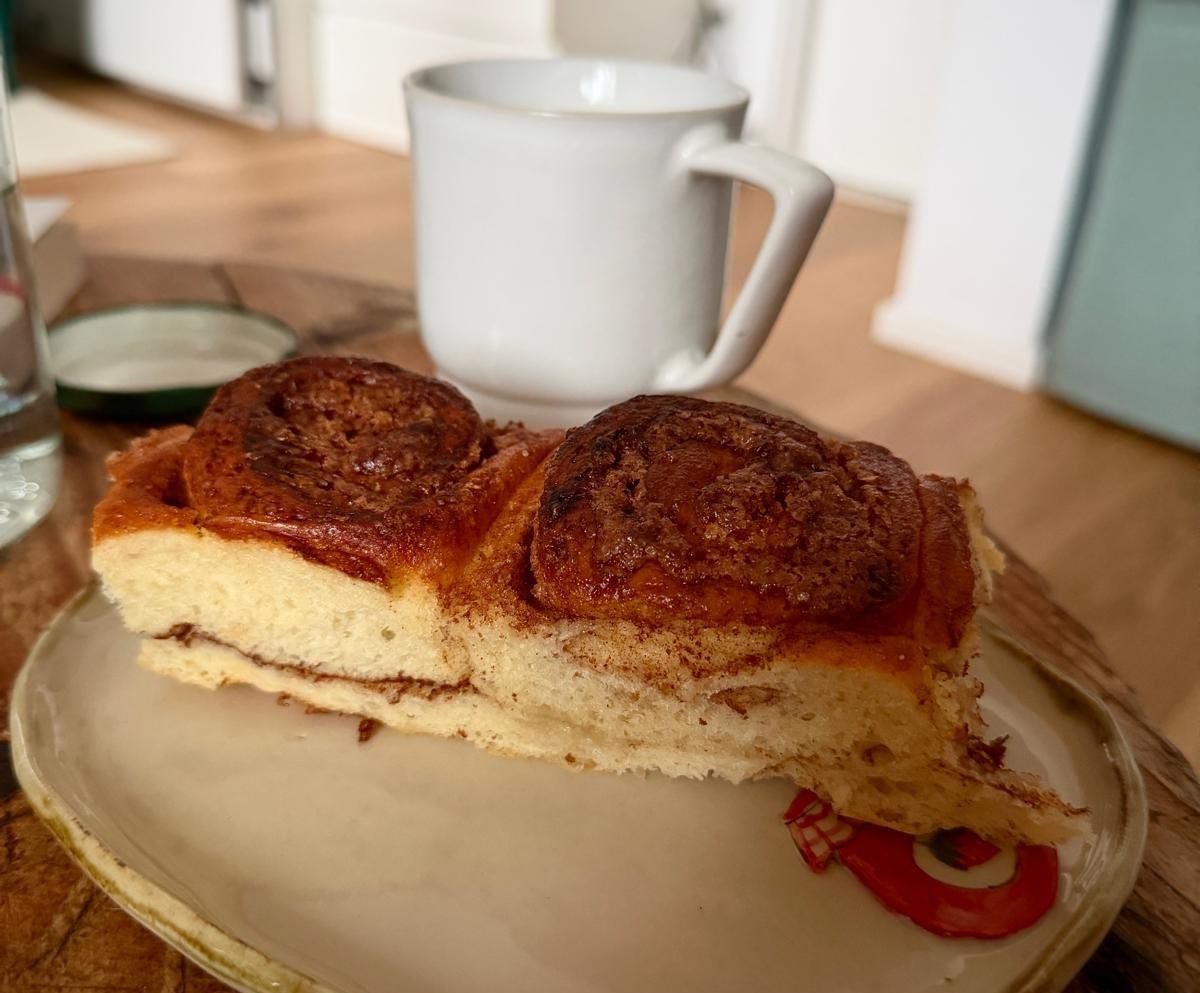 Prăjitura de cafecita a fost minunăția de mai sus- a făcut Mihai o rețetă de chifle cu scorțișoară care-i foaaaarte bună, dar pe el nu l-a convins suficient cât să o repete. Poate-l conving totuși până la Crăciun 🤭