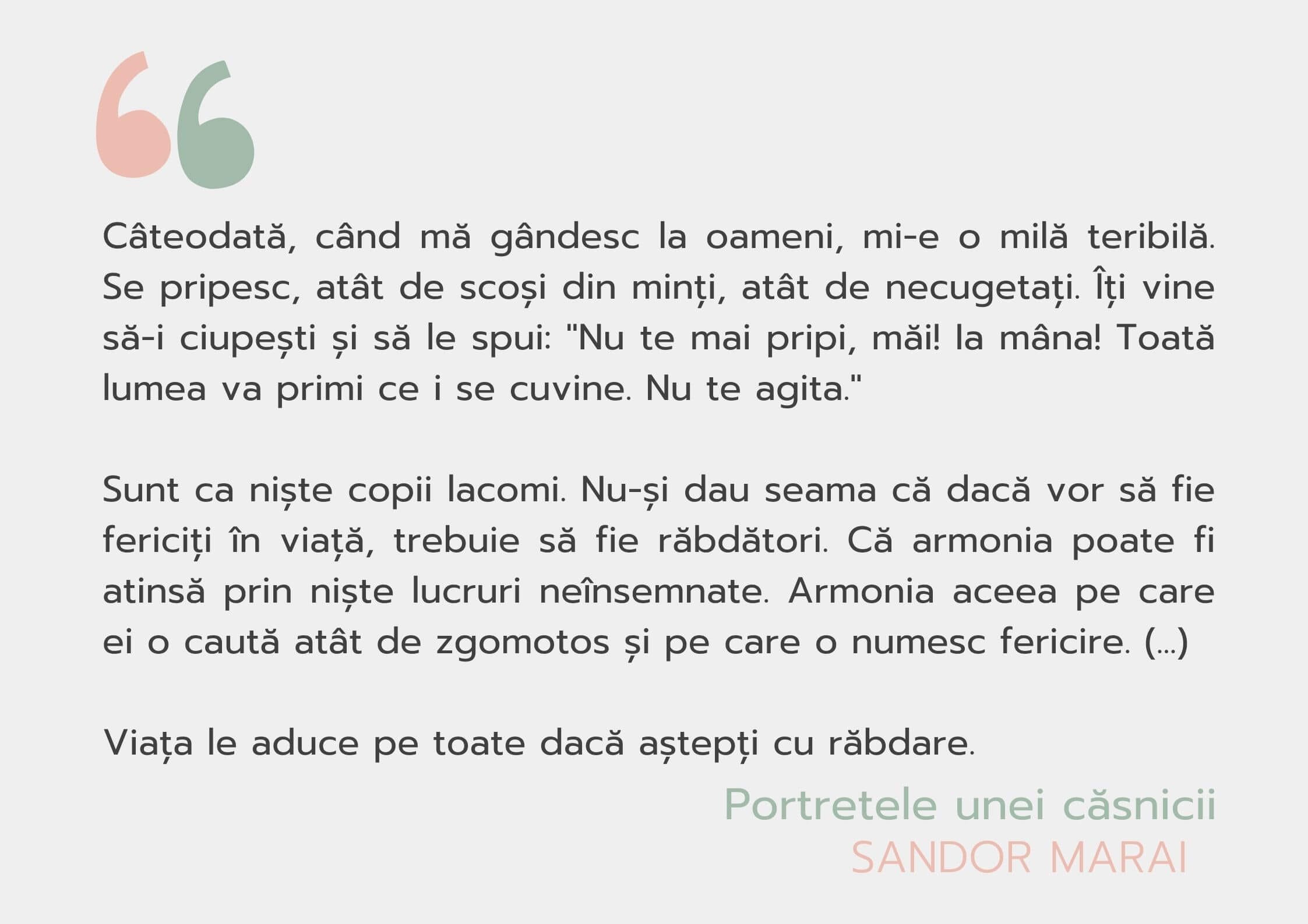 A doua carte de ficțiune de care-mi amintesc cu drag e “Portretele unei căsnicii”, de Sandor Marai. Ți-am recomandat-o într-un newsletter din martie, e povestea unei căsnicii spuse mai întâi din perspectiva primei soții, apoi a fostului ei soț, apoi a femeii care s-a căsătorit cu el după ce ei doi au divorțat. Și povestea m-a ținut lipită de carte, dar și faptul că acțiunea are loc în interbelic și e un sneak peak frumos în viața de familie a burgheziei maghiare din perioada aia.