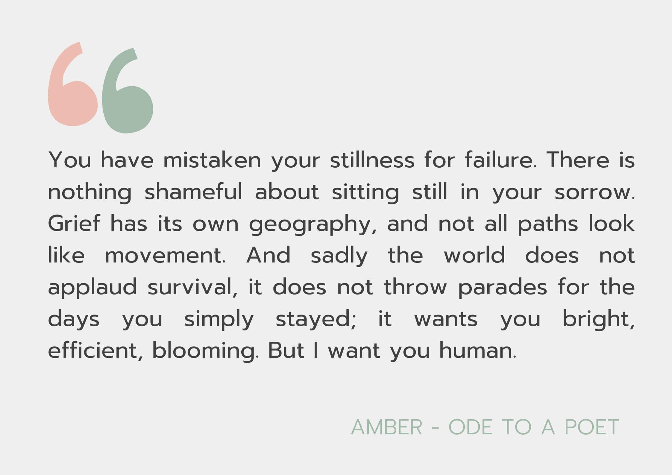 “There are oranges that burst dawn onto your tongue. There are songs you haven’t discovered that will feel like they’ve known you forever. There are books whose last lines will shake something loose in your ribcage. There is the warmth of a pet’s weight against your thigh. The scent of an old shirt still laced with the ghost of someone you loved. There is toast. There is honey. There is cinnamon on warm skin. (…) And you, you miraculous mosaic of nerves and nerve endings, you are still here. Even when your mind forgets how to want, your lungs keep rehearsing hope; do you know what that means? This breath means there is still time.”